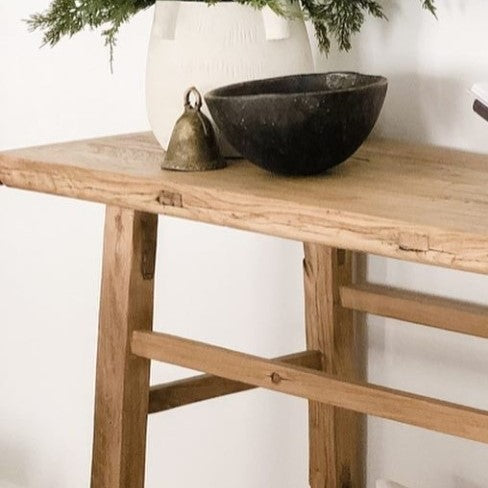 Sustainability meets style with our reclaimed wood console table, which highlights unique, eco-friendly materials with a rich patina and distinctive character. Ideal for those who appreciate a blend of history and environmental consciousness.