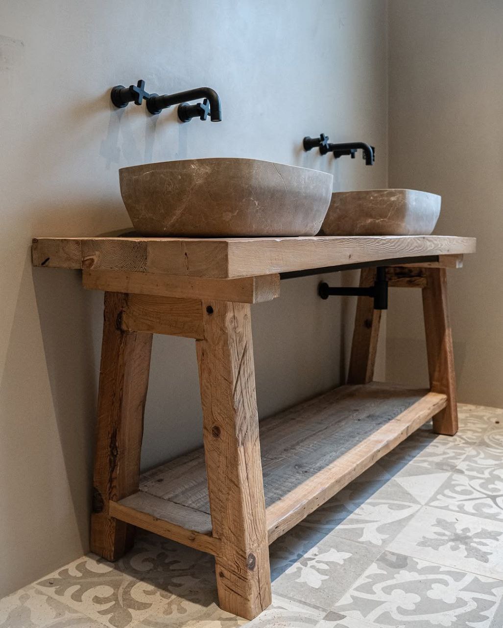 Rustic Oak Wood Bathroom Vanity with Open Shelf, Reclaimed Wood, Farmhouse Style